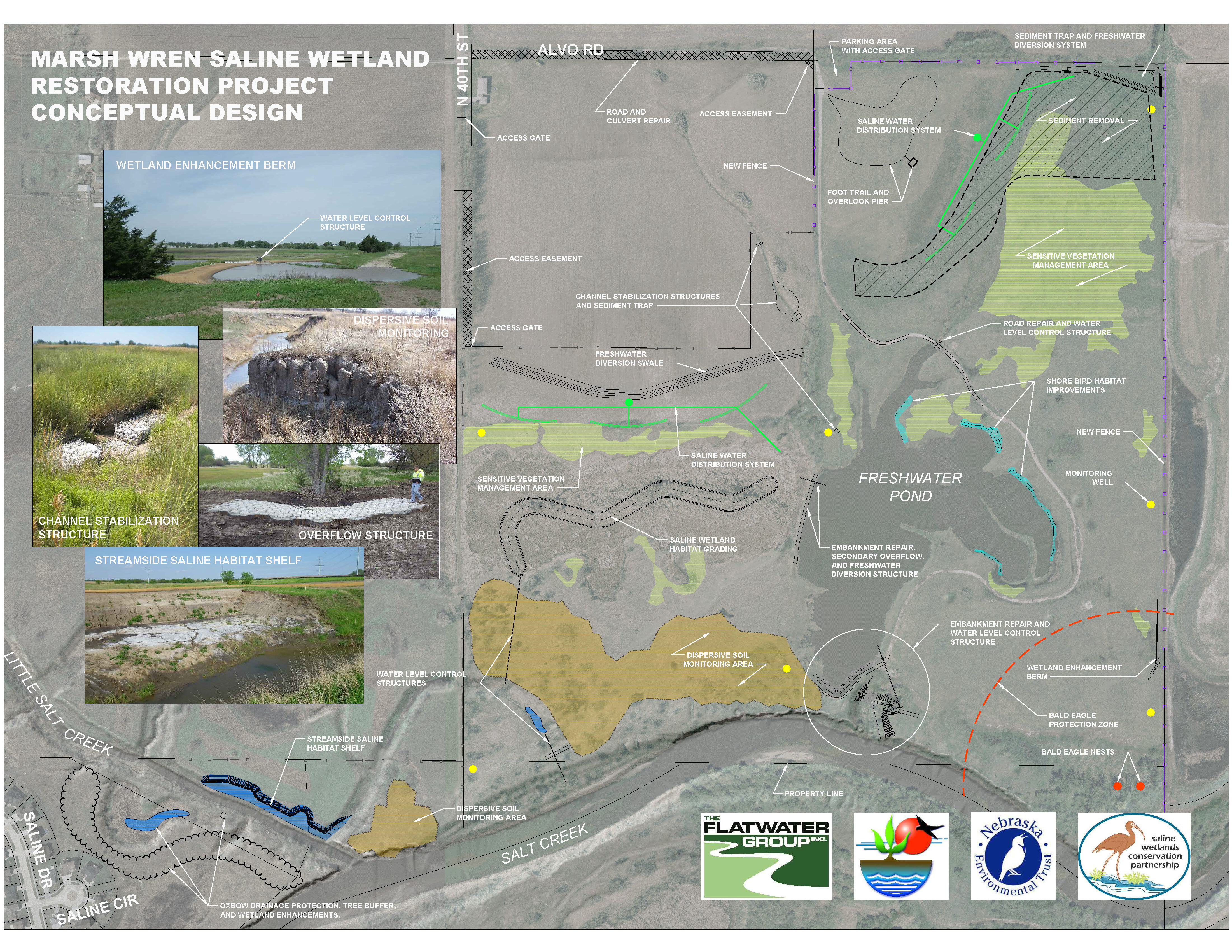 The Marsh Wren Community Wetland Area is located just north of Lincoln, NE, near the confluence of Salt Creek and Little Salt Creek. TFG was hired by LPSNRD to restore and enhance the hydrological features of the site to promote diverse wetland habitats including saline and fresh water wetlands.